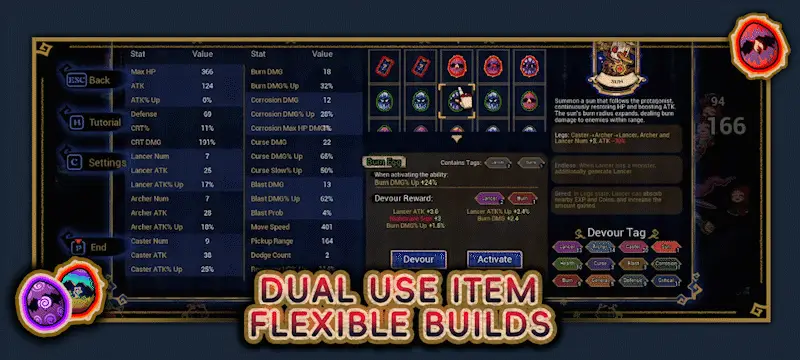 Dream Eggs are the core resource for enhancing attributes and building your playstyle. They can be obtained through leveling up, shop, or loot drops. Activate them in your inventory or devour them for completely different self-boosting effects. Manage them freely during play for highly flexible builds!