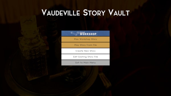 Included with the latest release of Vaudeville, you’ll find the brand-new Editor (VSVE), accessible by clicking the Workshop button in the main menu. From there, you can access different functionalities, ranging from creating your own stories and submitting them to the Steam Workshop, to running adventures locally or sharing them privately with friends through our .vsv file format.