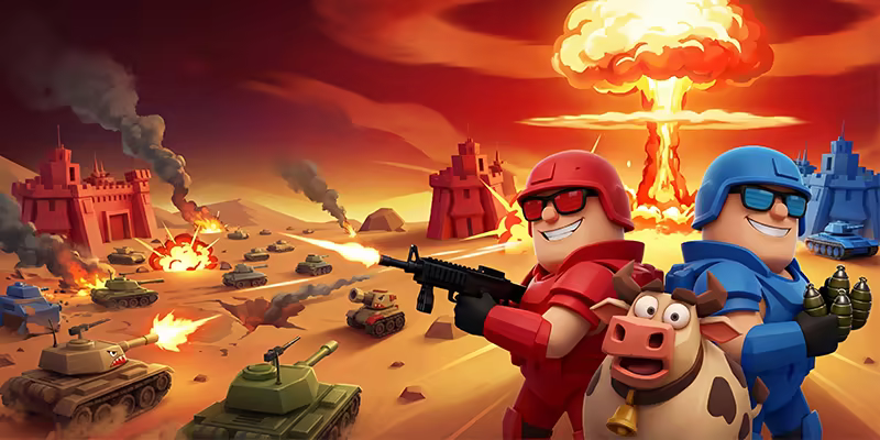 Lead the Red Desert Sharks against the Blue Empire of Metal Scull. The battlefield is a fully destructible playground. Blow up structures, torch the map, chain huge explosions, and keep the pressure on. Day flips to night, shadows slide across the terrain, and rain and thunder crash right into the fight.