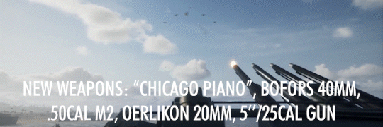 New weapons: New weapons include: Water cooled .50 cal M2 Browning, Oerlikon 20mm, Bofors twin 40mm, 1.1-inch/25cal "Chicago Piano", 5-inch/25cal gun!