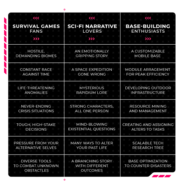 Gathered resources can be used in different ways – create necessary items or develop your base with additional modules like Research Lab or Social Room. Sometimes you will have to choose between creating items specially for your Alters and ones that could push the mission forward, like Anomaly Detectors or Radiation Filters. The burden of every decision lies solely on your shoulders as you will never be able to satisfy everyone’s needs.
